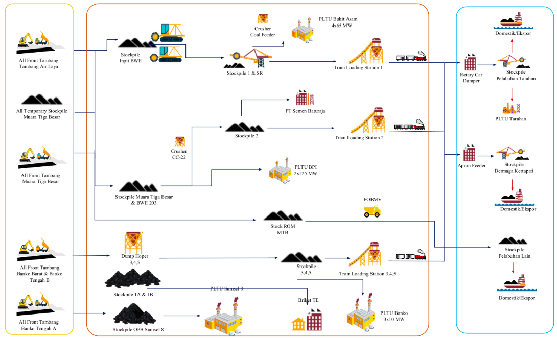 Perusahaan bekerjasama dengan PT Kereta Api Indonesia (Persero) atau KAI, untuk mengangkut batubara dari lokasi tambang ke lokasi pelabuhan dan dermaga milik Perusahaan yang berada di Kertapati, Palembang dan Tarahan, Lampung.