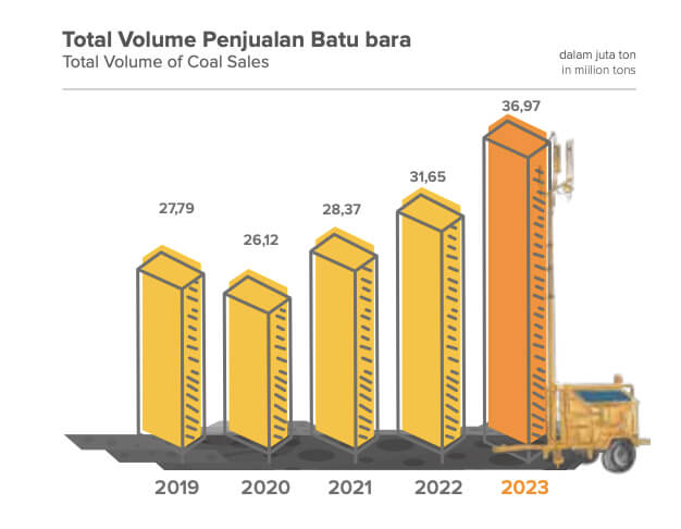Dari sisi volume penjualan batu bara, sepanjang tahun 2023, Perusahaan telah mencatatkan penjualan batu bara dengan total volume sebesar 36,97 juta ton, naik 17% dibandingkan dengan tahun 2022 yang mencapai 31,65 juta ton. Peningkatan ini seiring dengan peningkatan kebutuhan batu bara dalam negeri serta keberhasilan perusahaan dalam melakukan penetrasi pasar baru.